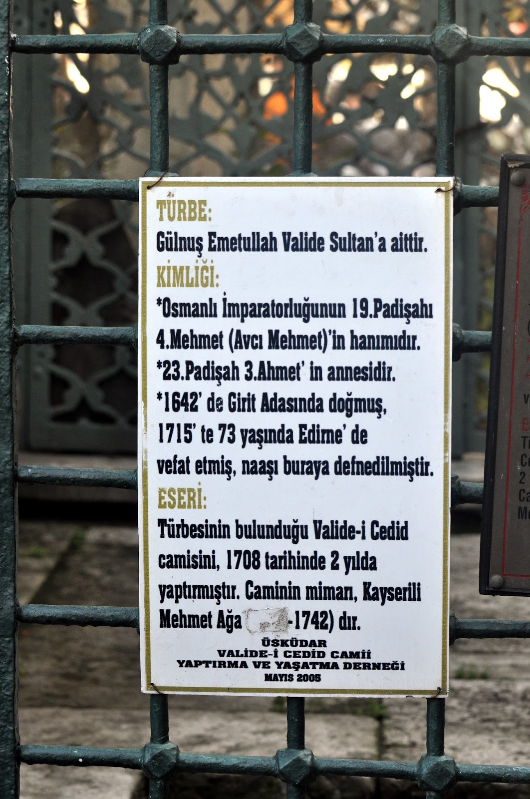 GÜLNUŞ EMETULLAH VALİDE SULTAN'ın türbesi de bu camide bulunmaktadır. Yukarıda haberi yapılan Yeni Valide Camii, diğer adıyla VALİDE-İ CEDİD CAMİ 1710 tarihinde yapılmıştır. Bu camideki yukarıda bahsi geçilen Altı Köşeli Yıldız ve Haç motiflerinin bulunduğu avluyu gördüğümüz deki heyecandan vede bizi götüren Üsküdarlı arkadaşımızın o anda bize Gülfem Hatun Cami olarak lanse etmesi nedeni ile, gördüğümüz eserlerinin heyecanından cami girişinde bulunan ismi araştırmadan bu yazıyı Gülfem Hatun Cami olarak yazdığımız için özür dileriz.